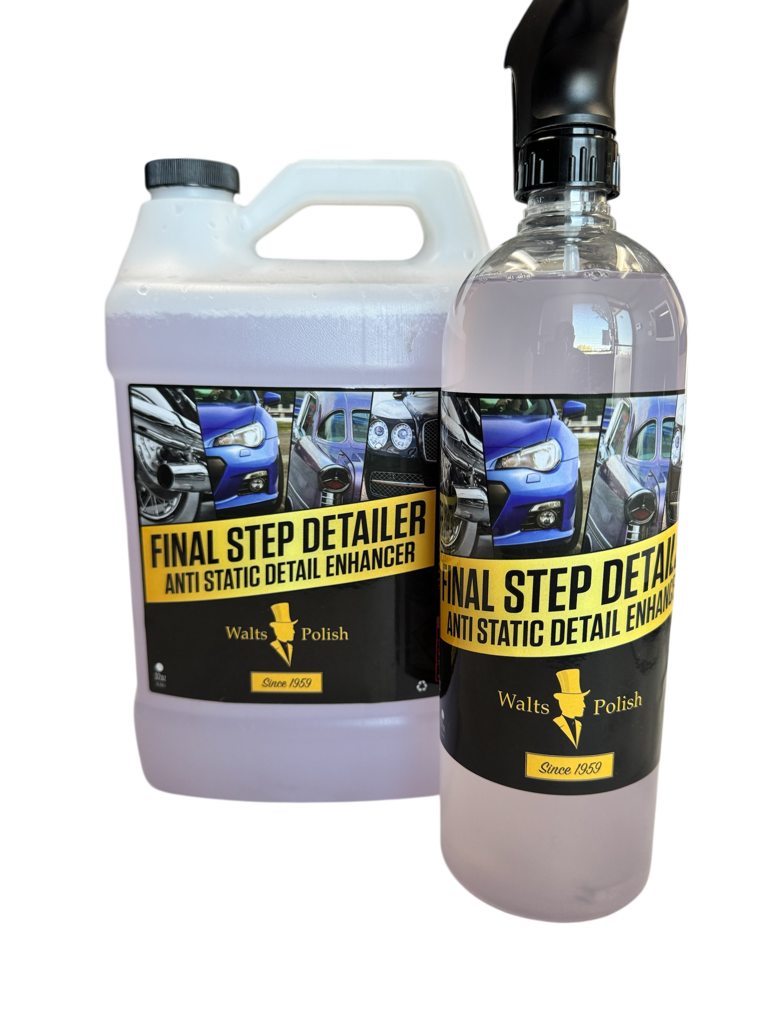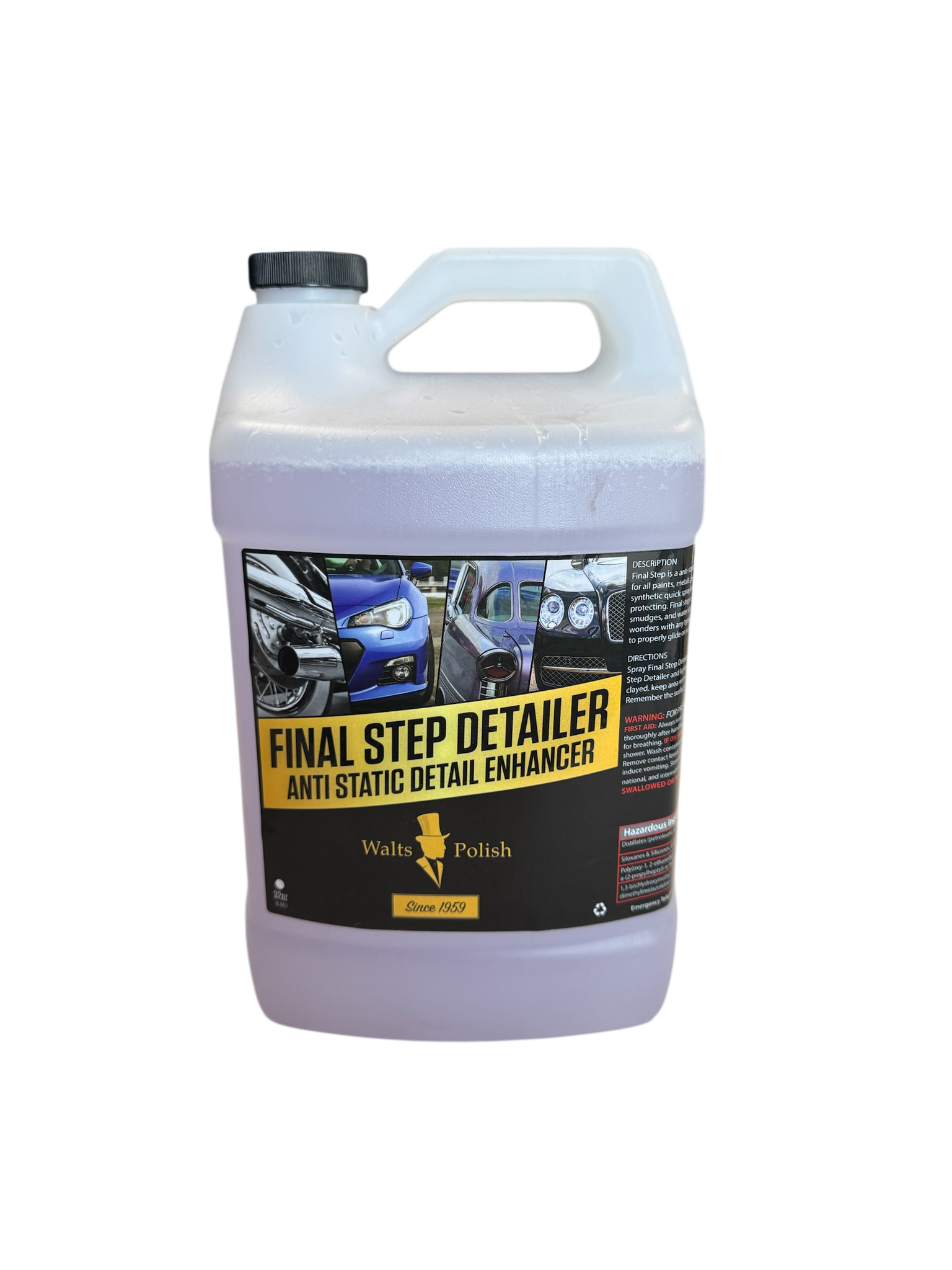 Final Step is a anti-static instant detail spray that enhances the shine of almost any surface. It’s great for all paints, metals, plastic, vinyl, chrome, and glass. Does not smear or streak. Final step is a synthetic quick spray detailer that gives you the best of both worlds in actually shining and protecting. Final step unlike other detail sprays if formulated to clean and remove all finger prints, smudges, and water streaks. Final step is formed with special wetting agents that allow it to work wonders with any type of clay bar. It’s extremely slick wetting agents allow for clay bars or nano skins to properly glide on surfaces without sticking or stopping and prevents. Its developed with a synthetic detailer to deliver a deep wet shine for a hard lasting protection. Final step is great on any color paint surface allowing you to just spray and wipe with a microfiber towel. This anti-static, synthetic spray detailer reduces the amount of static created when applying unlike a normal wax detailer. Final steps synthetic design allows for a low static application which reduces the amount of dust that attracts to your car by 50% or more at all times. When choosing a quick detailer